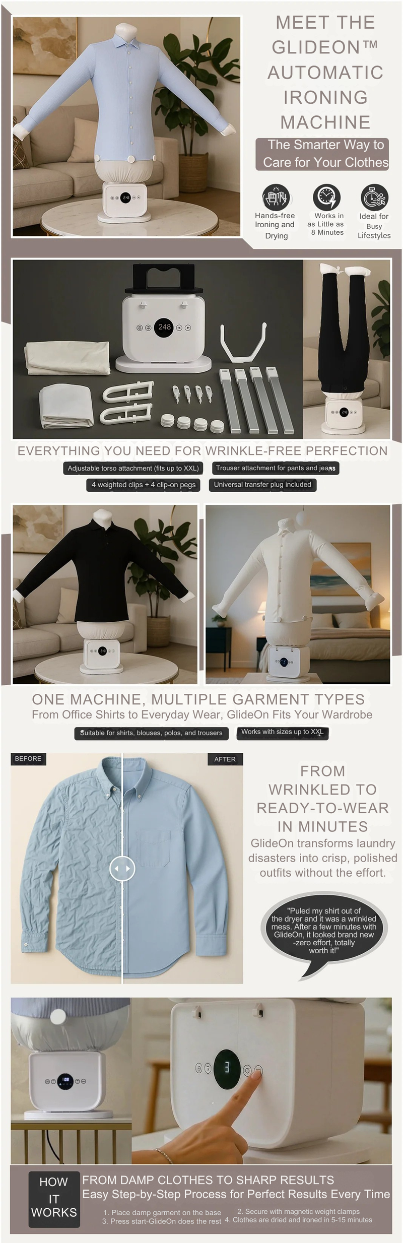 GLIDEON™ streamlines your routine with hands-free ironing, fast results, and gentle fabric care. Keeping your clothes sharp without ever needing an ironing board!